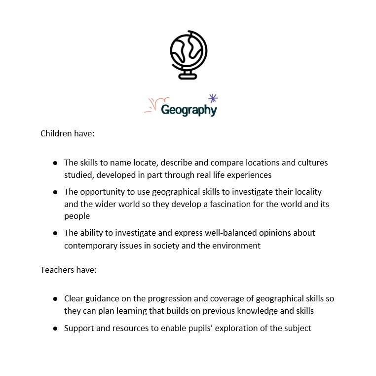 Children are encouraged to develop an awareness and knowledge of their local area, the wider world and their place in it. Children will develop their skills and understanding through key concepts. Throughout their geographical journey, the children will explore and apply the knowledge categories in each unit. We aim to inspire children with curiosity to discover the world and that they are accepting of all other cultures. We want to enable children to know about the location of the world’s continents, countries, cities, seas and oceans. Children will develop their skills by interpreting a range of sources and communicate their learning through a variety of methods. Children will understand how the human and physical features of a place shapes its location and how it can change over time. Furthermore, we want children to be inquisitive and develop a love for learning about the world around them.