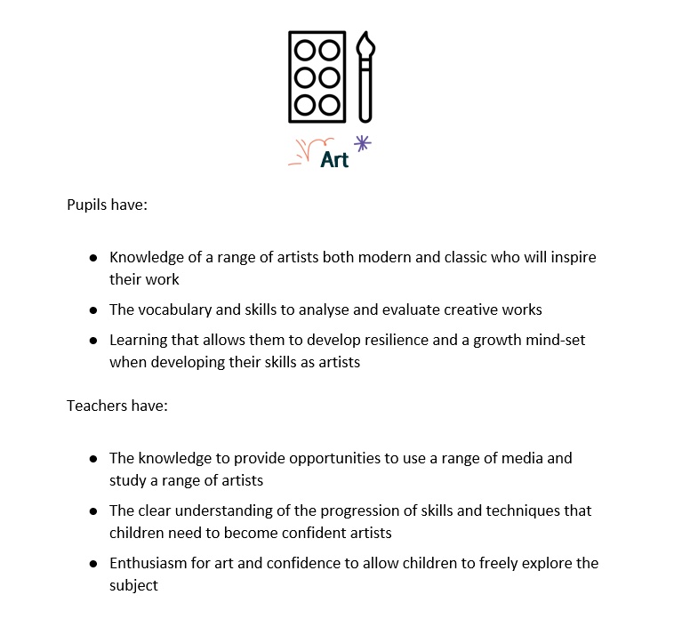 We are dedicated to providing an inclusive Art & Design curriculum that values every child as an artist as part of our broad curriculum. We aim to engage and inspire pupils with both visual and tactile experiences while providing opportunities to express their own thoughts and ideas in a variety of media. Our Art & Design curriculum balances knowledge and skills while fostering a love of Art & Design through curiosity and creativity. By exploring a diverse range of artists, materials and processes, children enhance their understanding of different cultures and time periods. The skills, communication and enjoyment we develop through the Art and Design curriculum enriches our lives, develops critical thinkers and helps us to understand the world.